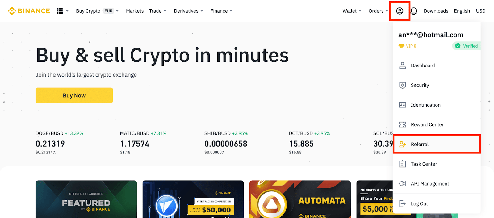 1. Log into your Binance account and click [Profile] - [Referral]. You can also access it from here